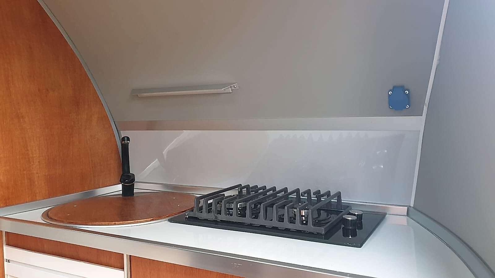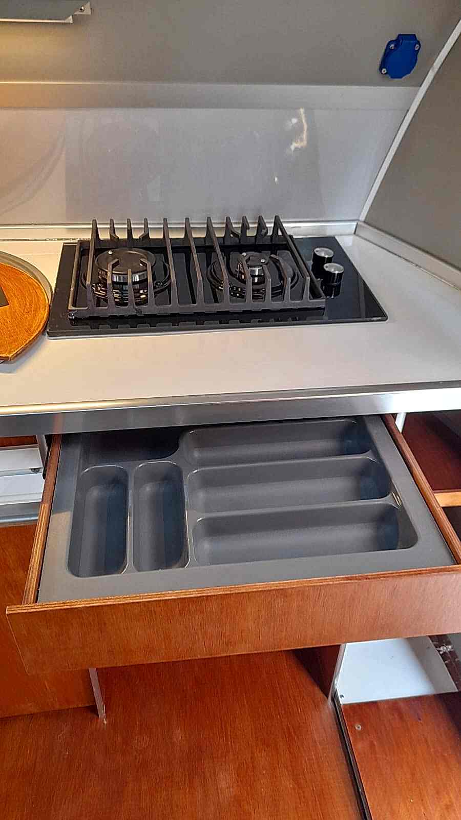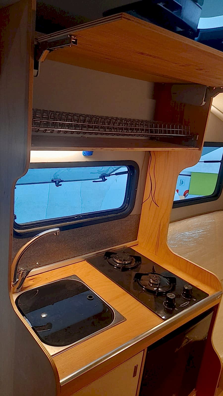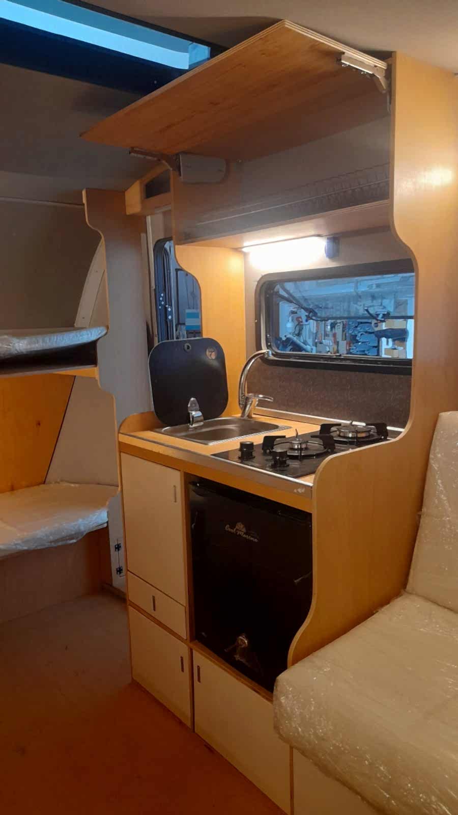 * 86 cm mutfak modülü / 50 lt 12 v buzdolabı entegre / üst dolap / 70 cm dışarı açılır mutfak havalandırma camı / 1 adet kaşık çekmecesi mutfakta 3 adet 220v priz.