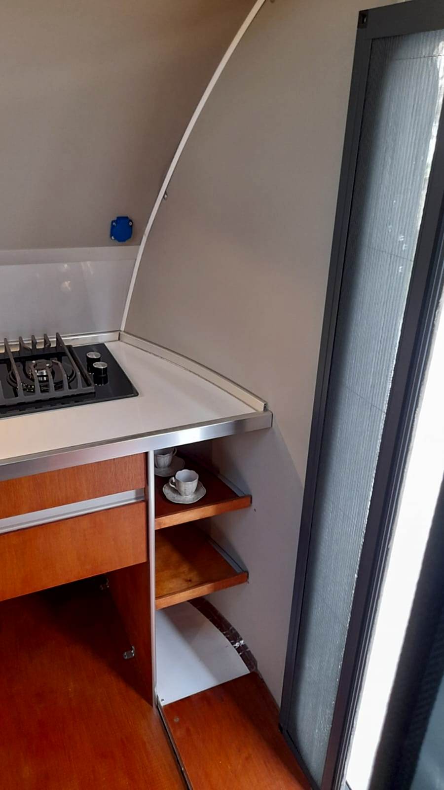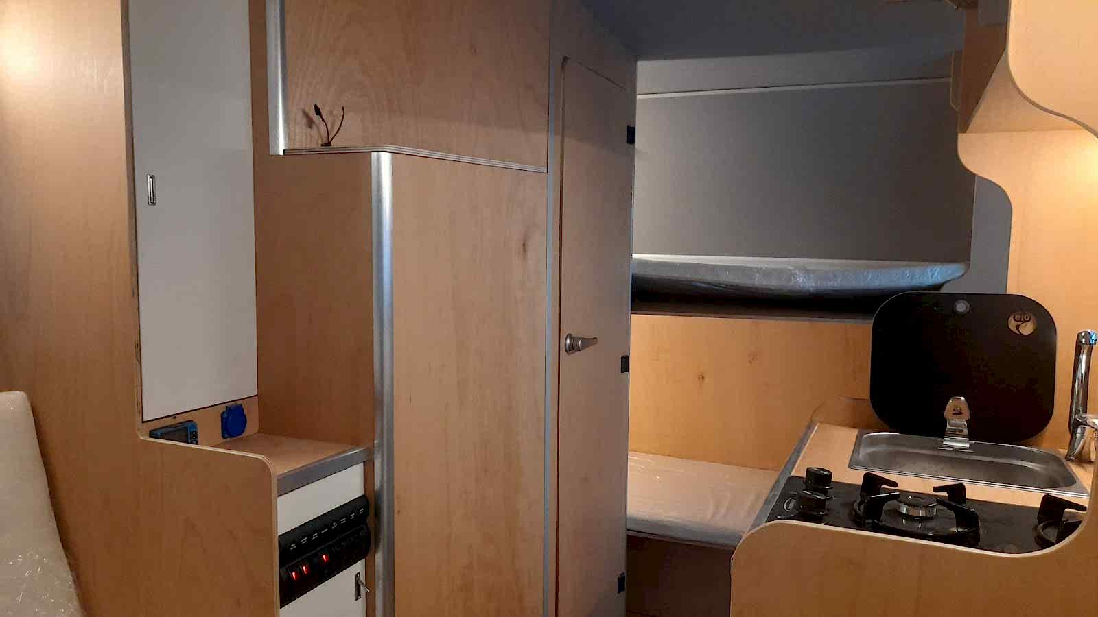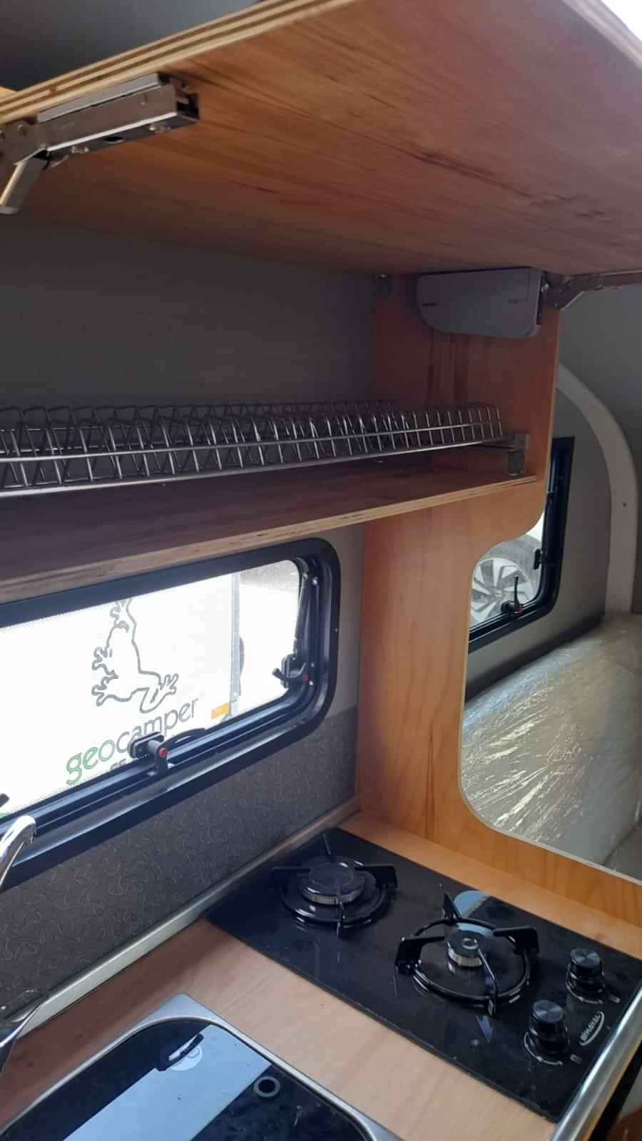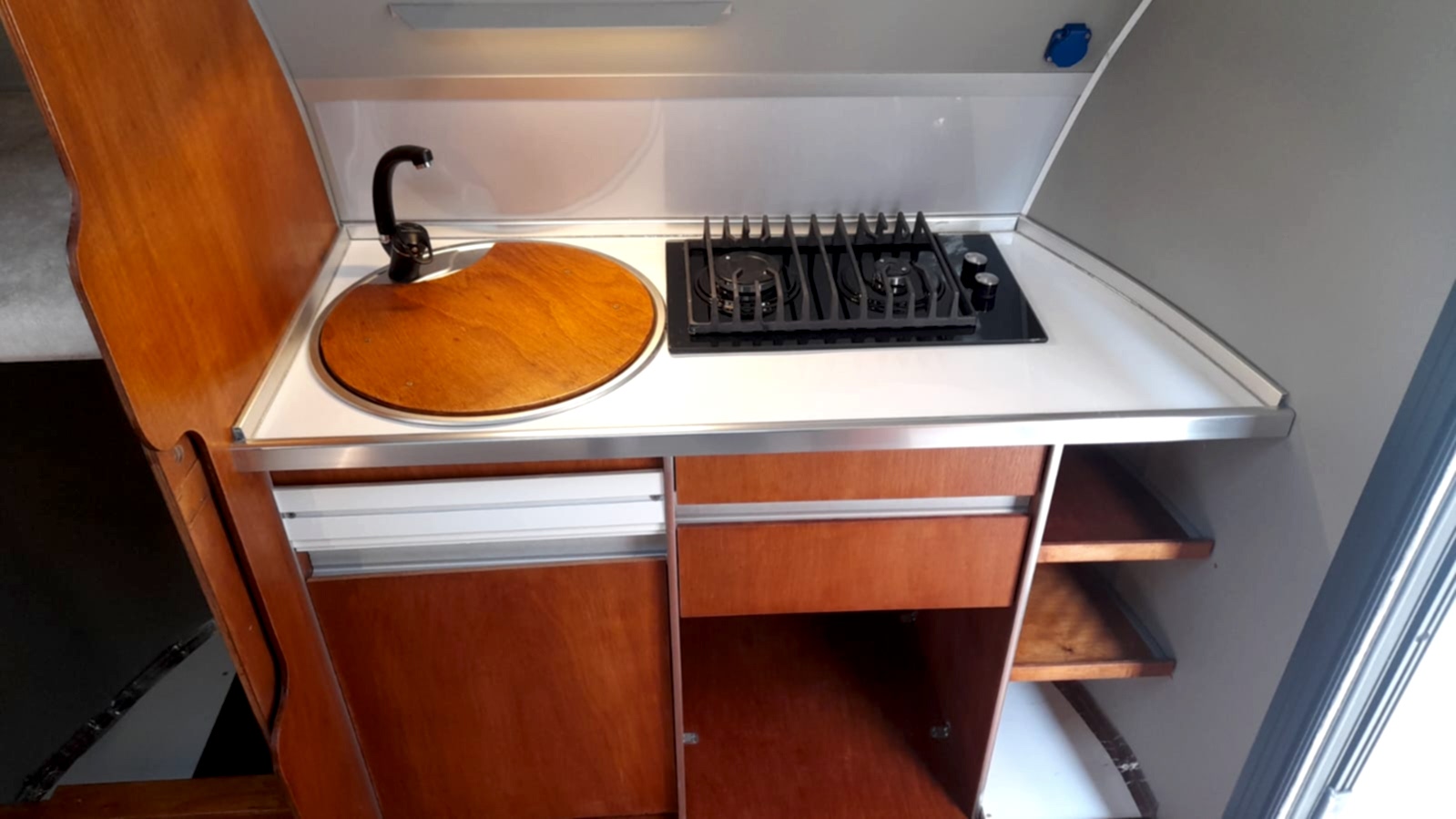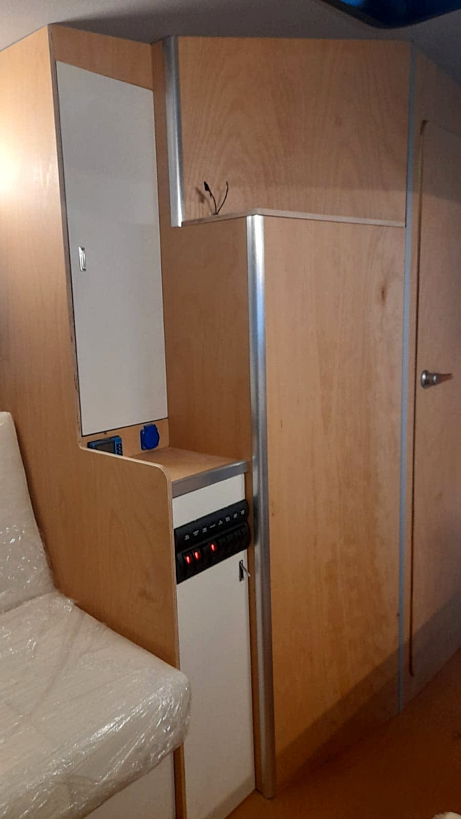 * 86 cm mutfak modülü / 50 lt 12 v buzdolabı entegre / üst dolap / 70 cm dışarı açılır mutfak havalandırma camı / 1 adet kaşık çekmecesi mutfakta 3 adet 220v priz.