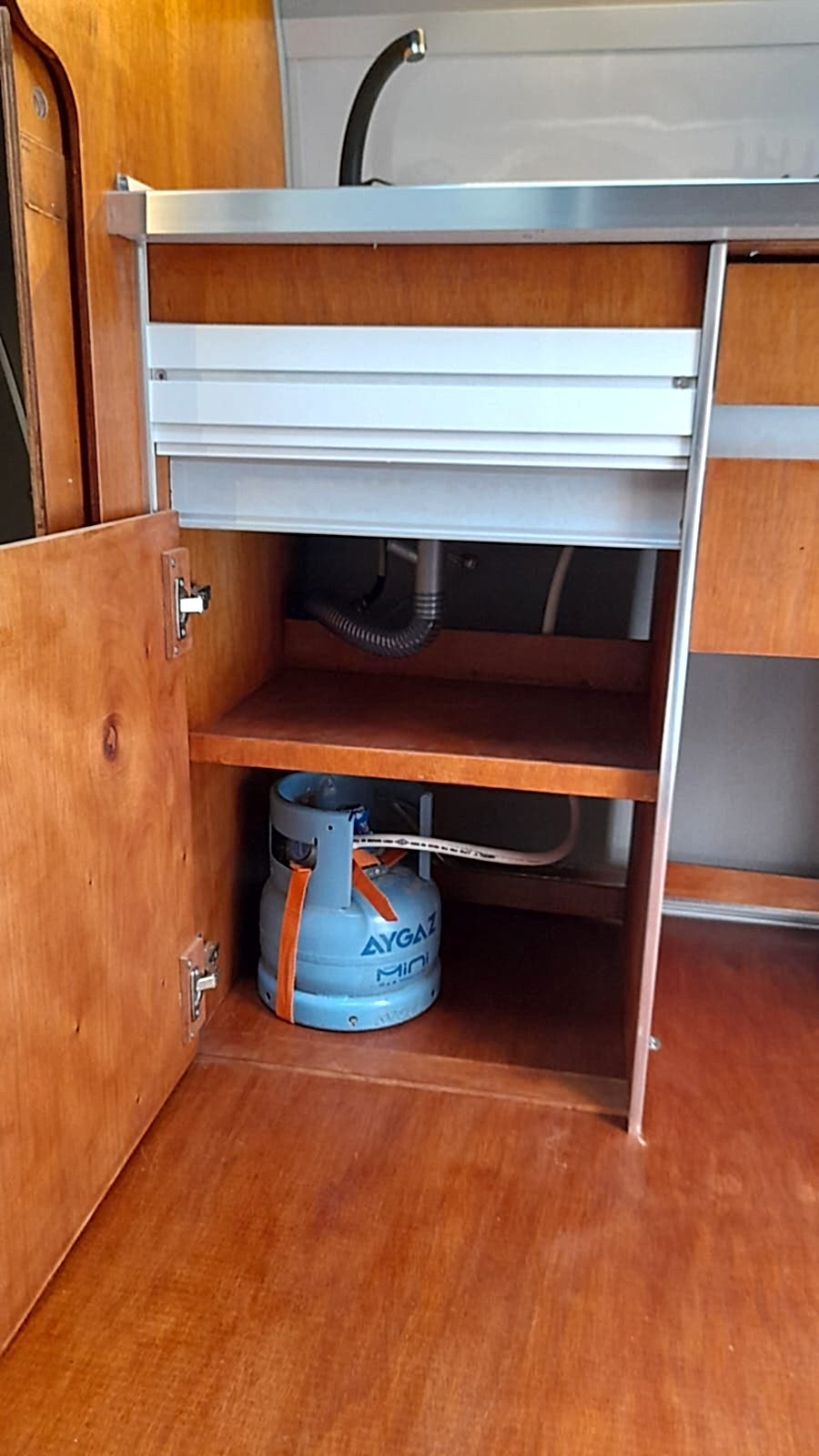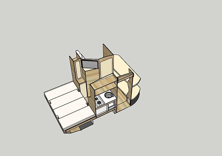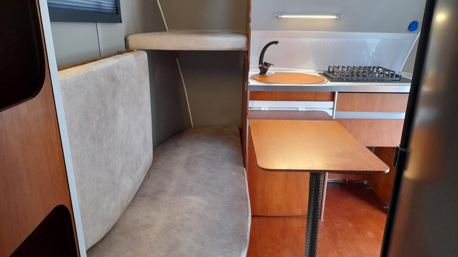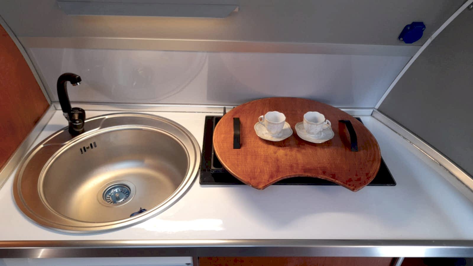 * 86 cm mutfak modülü / 50 lt 12 v buzdolabı entegre / üst dolap / 70 cm dışarı açılır mutfak havalandırma camı / 1 adet kaşık çekmecesi mutfakta 3 adet 220v priz.