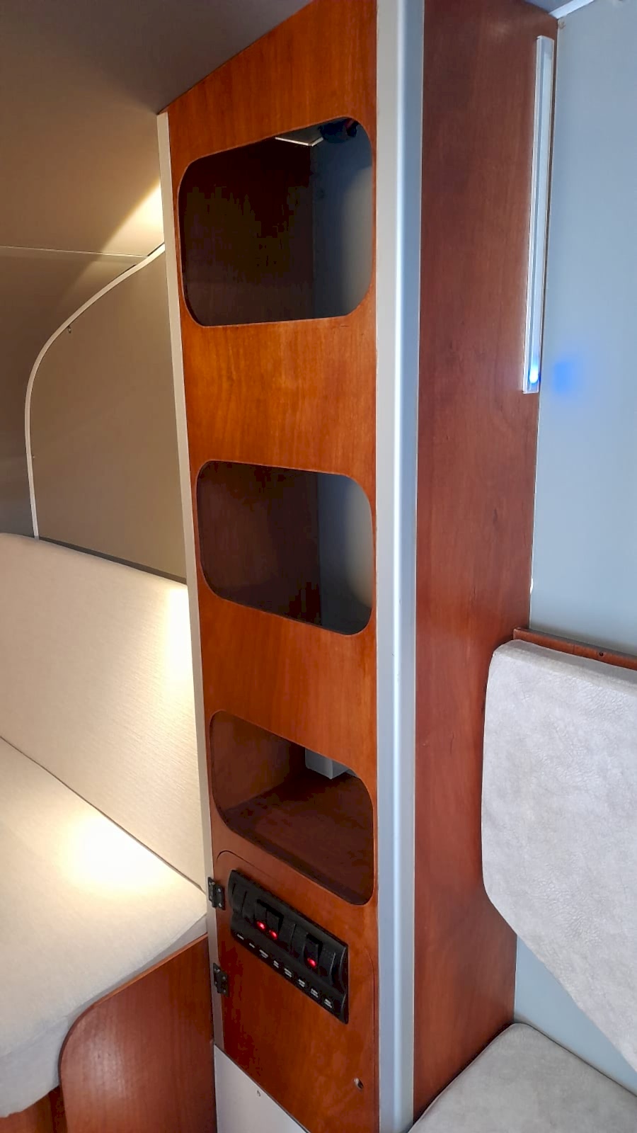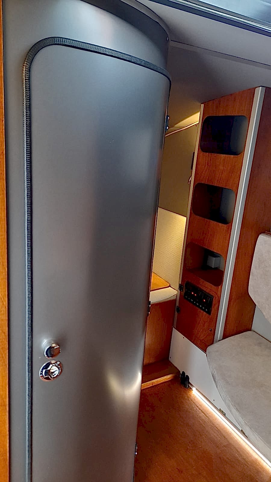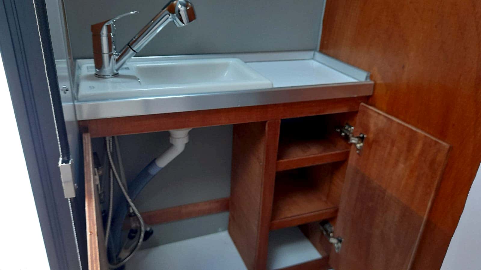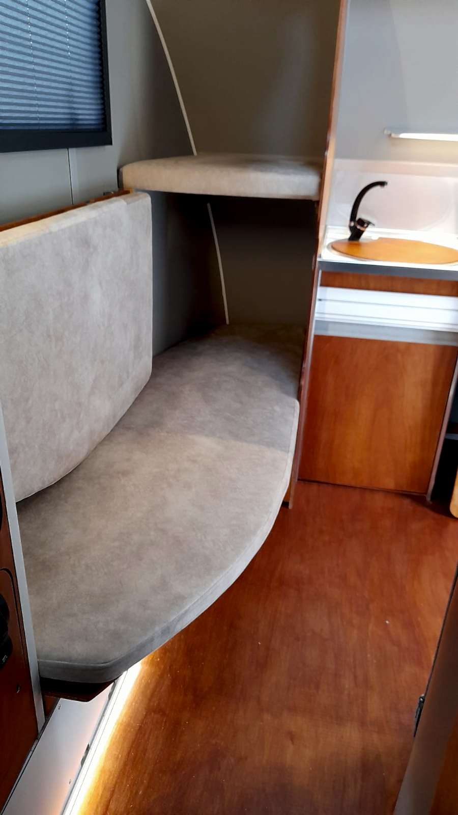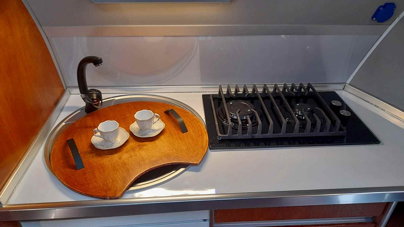 * 86 cm mutfak modülü / 50 lt 12 v buzdolabı entegre / üst dolap / 70 cm dışarı açılır mutfak havalandırma camı / 1 adet kaşık çekmecesi mutfakta 3 adet 220v priz.