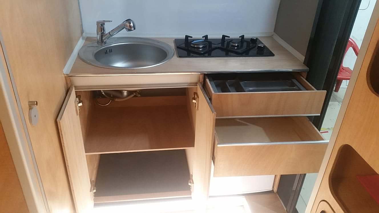 - Tüm mobilyalar da ve iç zemin döşemelerinde suya dayanıklı WBP tutkallı Marin Kontra Doğal Ahşap malzemeler kullanılmış olup Karvavanın hiçbir yerinde pvc membran kaplama/laminat parke/ suntalam /mdflam/pvc lambri gibi malzemeler kullanılmamıştır.
